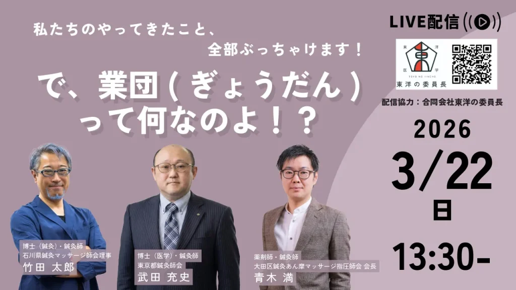 【無料オンラインセミナー】で、業団って何なのよ!? 無料オンラインセミナー 「で、業団って何なのよ!?」 鍼灸師として働く中で感じる「業界団体」への素朴な疑問。 実際の活動や裏側を、ぶっちゃけトークで語り尽くします! さらに、大田区鍼灸師会・...